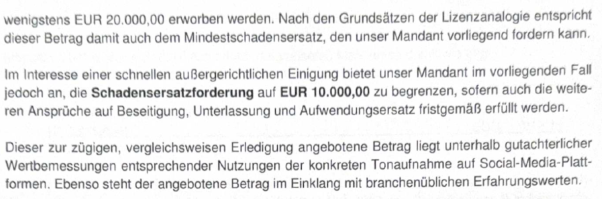 Der abgemahnte Unternehmer soll nun eine Unterlassungserklärung abgeben und für die Nutzung auf Instagram sage und schreibe EUR 10.000,00 zahlen. Angeblich würde der Rechteinhaber das 08/15-Klaviergeklimpere für nicht unter EUR 20.000,00 lizenzieren. Hinzu kommen Anwaltskosten in einer Höhe von EUR 1.153,60. Insofern unterscheiden sich diese Social Media Abmahnungen bezüglich der Forderungshöhe ganz erheblich von den Frommer Legal Abmahnungen wegen Filesharings:
