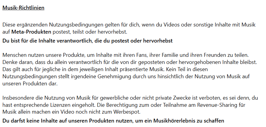 Instagram-Nutzer müssen wissen, dass die Musik in der Instagram-Bibliothek nur für private und nicht für kommerzielle Zwecke kostenlos zur Verfügung gestellt wird. Privatpersonen bekommen daher keine Abmahnung wegen Musik auf Instagram. Es muss zwingend ein Bezug zu einer gewerblichen Tätigkeit gegeben sein. Dies geht aus den Nutzungsbedingungen von Instagram (Meta) für Musik hervor: